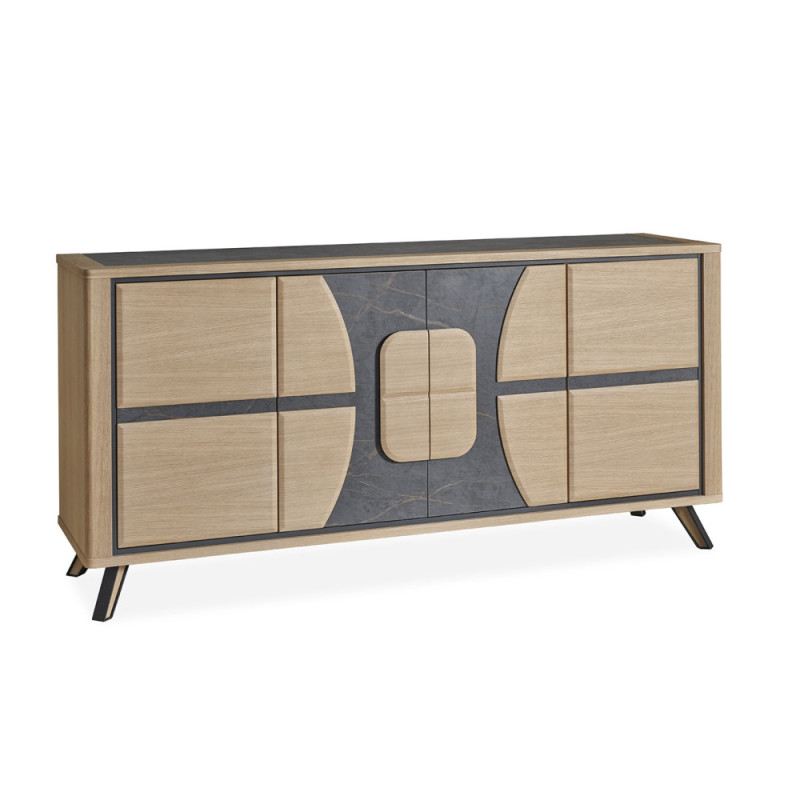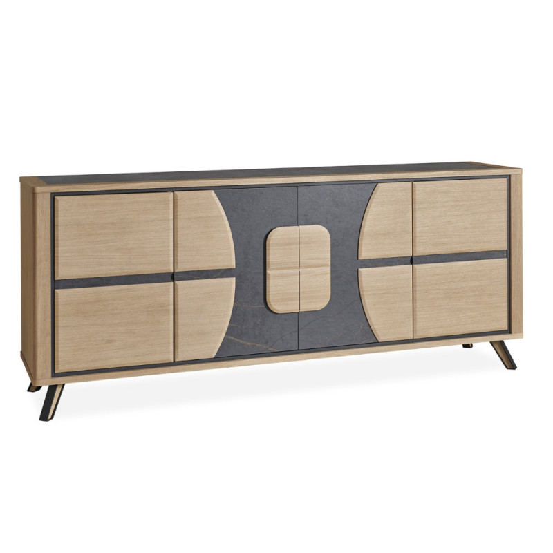 Découvrez l'élégante enfilade OMEGA, un chef-d'œuvre exquis en placage chêne, soigneusement conçu avec quatre portes sophistiquées. Les portes centrales, ornées d'une sublime incrustation en céramique, apportent une touche de modernité et de luxe, tandis que le plateau, accentue l'harmonie de l'ensemble.