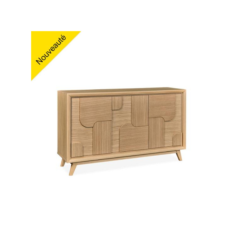 Meubles : Portes : Panneaux de particules revêtus de placage chêne et décor structuré façon "gouge". Côtés : Panneaux de particules revêtus de placage chêne. Dessus : Panneaux de particules revêtus de placage chêne avec chants en bois de bout. Cadre de façade : panneau de fibre moyenne densité revêtus de placage chêne. Derrières, séparations, fonds et tablettes : Panneaux de particules revêtus de placage chêne. Tiroirs : Caisses en panneaux de particules revêtus de placage chêne. fonds en panneaux de fibres moyenne densité revêtus de placage chêne. Pieds : Chêne massif.