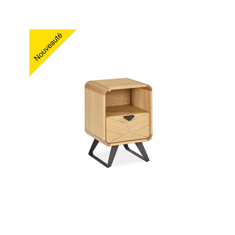 Meubles : Portes : Panneaux de particules revêtus de placage chêne avec décor façon "chevron". Côtés : Panneaux de particules revêtus de placage chêne. Dessus : Panneaux de particules revêtus de placage chêne. Arrondis dans les angles : chêne massif. Derrières, séparations, fonds et tablettes : Panneaux de particules revêtus de placage chêne. Tiroirs : Caisses en panneaux de particules revêtus de placage chêne. Fonds en panneaux de fibres moyenne densité revêtus de placage Pieds : Pieds fer fintion époxy.
