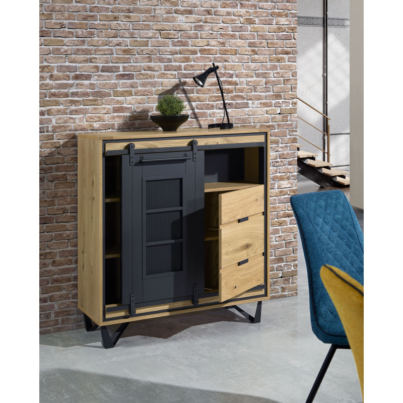 Porte gauche coulissante sur roulettes avec décor métal perforé