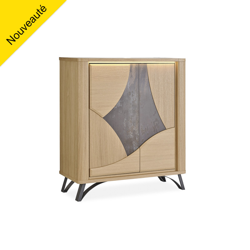 Meubles : Portes : Panneaux de particules revêtus de placage chêne et décor structuré façon "gouge". Côtés : Panneaux de particules revêtus de placage chêne. Dessus : Panneaux de particules revêtus de placage chêne avec chants en bois de bout. Cadre de façade : panneau de fibre moyenne densité revêtus de placage chêne. Derrières, séparations, fonds et tablettes : Panneaux de particules revêtus de placage chêne. Tiroirs : Caisses en panneaux de particules revêtus de placage chêne .fonds en panneaux de fibres moyenne densité revêtus de placage chêne. Pieds : Chêne massif.