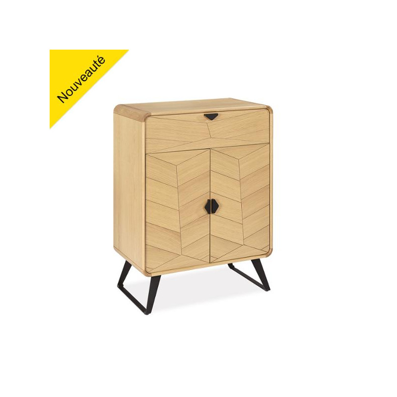 Meubles : Portes : Panneaux de particules revêtus de placage chêne avec décor façon "chevron". Côtés : Panneaux de particules revêtus de placage chêne. Dessus : Panneaux de particules revêtus de placage chêne. Arrondis dans les angles : chêne massif. Derrières, séparations, fonds et tablettes : Panneaux de particules revêtus de placage chêne. Tiroirs : Caisses en panneaux de particules revêtus de placage chêne. Fonds en panneaux de fibres moyenne densité revêtus de placage Pieds : Pieds fer fintion époxy. Finition : Finition : teinte acrylique - vernis de finition acrylique Pour les meubles, de légères différences de tons peuvent exister suivant les séries.
