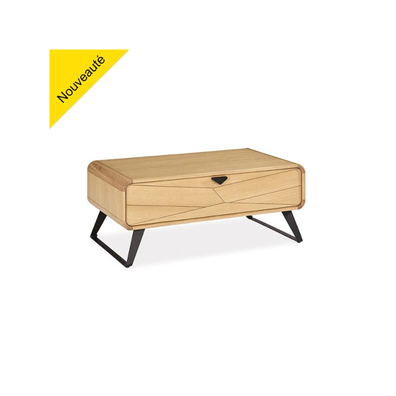 Meubles : Portes : Panneaux de particules revêtus de placage chêne avec décor façon "chevron". Côtés : Panneaux de particules revêtus de placage chêne. Dessus : Panneaux de particules revêtus de placage chêne. Arrondis dans les angles : chêne massif. Derrières, séparations, fonds et tablettes : Panneaux de particules revêtus de placage chêne. Tiroirs : Caisses en panneaux de particules revêtus de placage chêne. Fonds en panneaux de fibres moyenne densité revêtus de placage Pieds : Pieds fer fintion époxy.