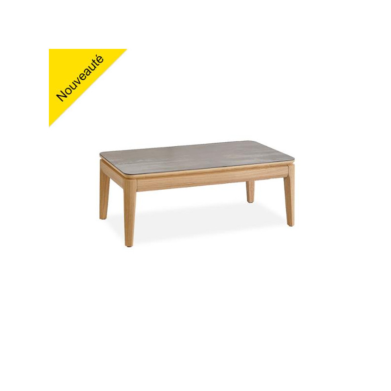 Table de salon et console : Plateau : Panneaux de particules revêtus de céramique brun panaché - Pieds : Charme massif plaqué chêne.