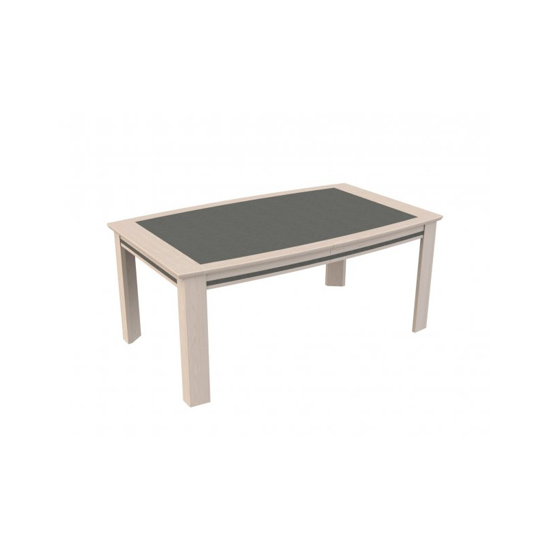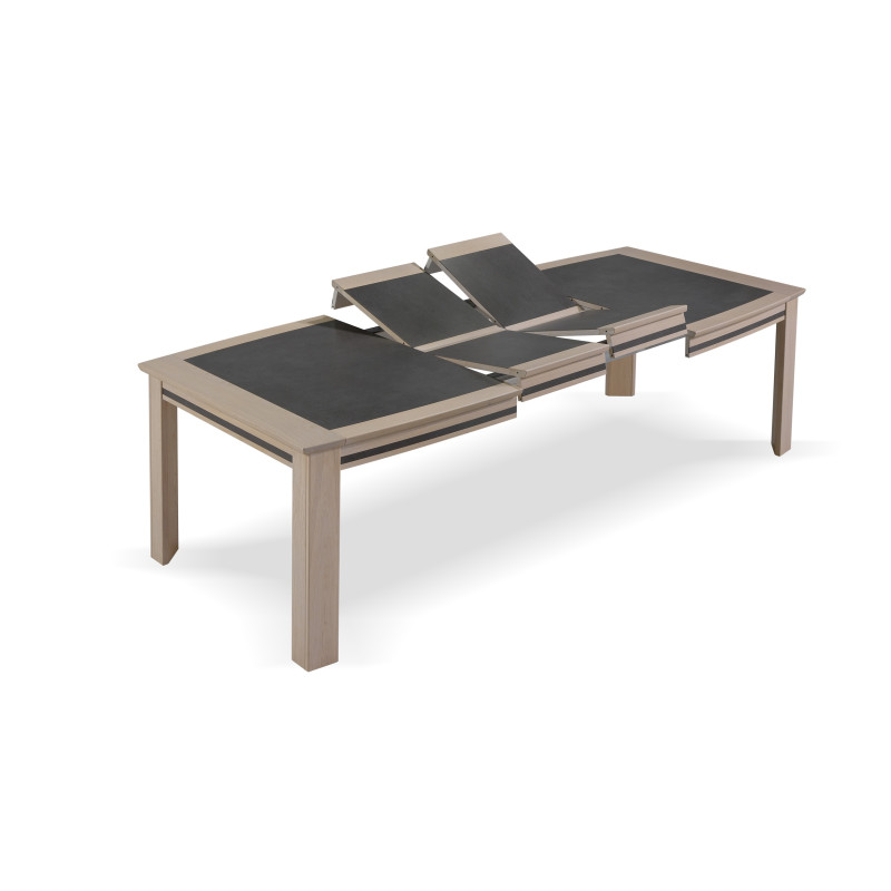 Dessus et allonges : Encadrement chêne massif avec intérieur en panneau de fibres moyenne densité avec incrustation céramique.