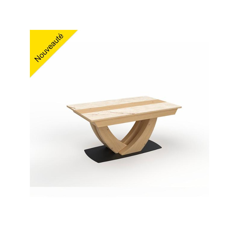 Tables de repas : Piètement : Panneaux de fibres moyenne densité, multiplis et charme massif revêtus de placage chêne. Traverses de ceinture : Charme massif revêtus de placage chêne - Structure intérieure : Charme massif. Plateaux et allonge : Panneaux de particules revêtus de céramique beige veiné avec chemin de table en panneaux de fibres revêtus de placage chêne.