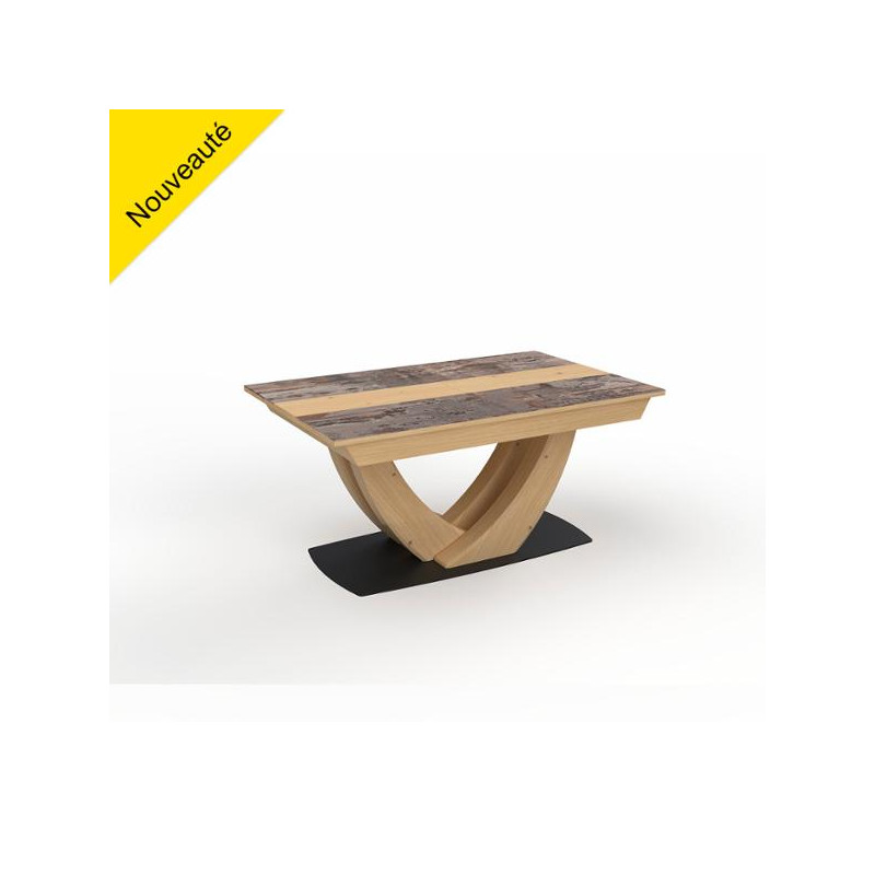 Tables de repas : Piètement : Panneaux de fibres moyenne densité, multiplis et charme massif revêtus de placage chêne. Traverses de ceinture : Charme massif revêtus de placage chêne - Structure intérieure : Charme massif. Plateaux et allonge : Panneaux de particules revêtus de céramique beige veiné avec chemin de table en panneaux de fibres revêtus de placage chêne.
